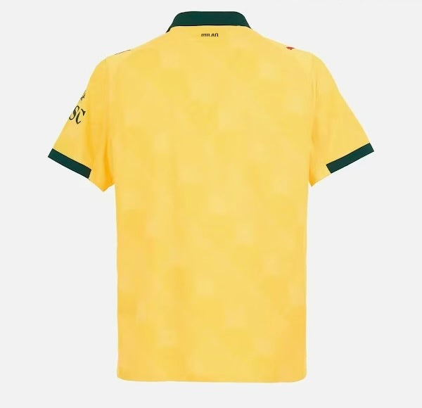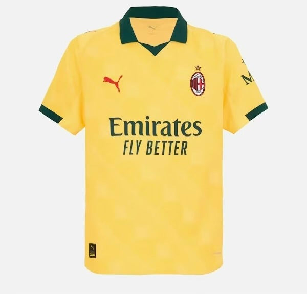 AC Milan 2025‑26 Third Kit AC Milan’s third jersey for the 2025‑26 season delivers a bold fashion statement. Draped in a vibrant sunny yellow, it features subtle geometric patterns and a contrasting deep green polo collar and sleeve trim. The iconic ACM monogram is reimagined in an all-over jacquard texture as a tribute to the club’s 1995‑96 glory era. Puma’s red Cat‑logo and the club crest in matching red provide sharp contrast, while the Emirates “Fly Better” sponsor is tinted green to tie the palette together