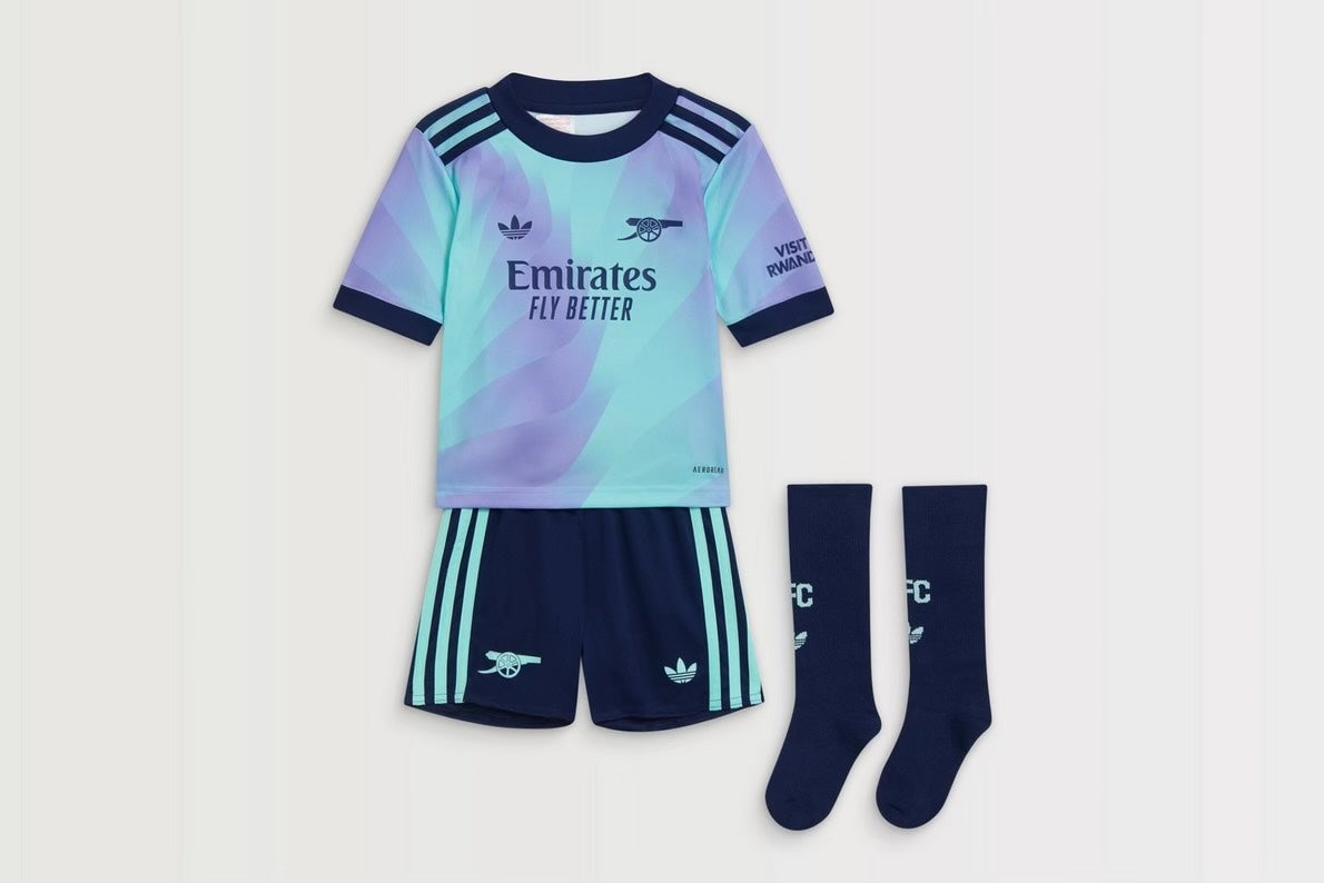 The Arsenal 24/25 third jersey features a striking mint green base, accented with navy blue details. The shirt's modern design is highlighted by a subtle geometric pattern that pays homage to the club's rich history. The lightweight fabric and sleek fit ensure comfort and performance, making it a standout choice for Gunners fans.