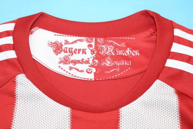 The Bayern Munich 2010/11 home jersey is a classic representation of the club's rich history and tradition. It features the iconic red color with bold white vertical stripes, symbolizing the team's dynamic and powerful presence on the field. The Adidas logo and Bayern Munich crest are prominently displayed on the chest, adding to the jersey's authentic and prestigious design. Made from high-quality, breathable fabric, this jersey ensures comfort and performance for both players and fans. Its timeless design and attention to detail make it a must-have for any Bayern Munich supporter.