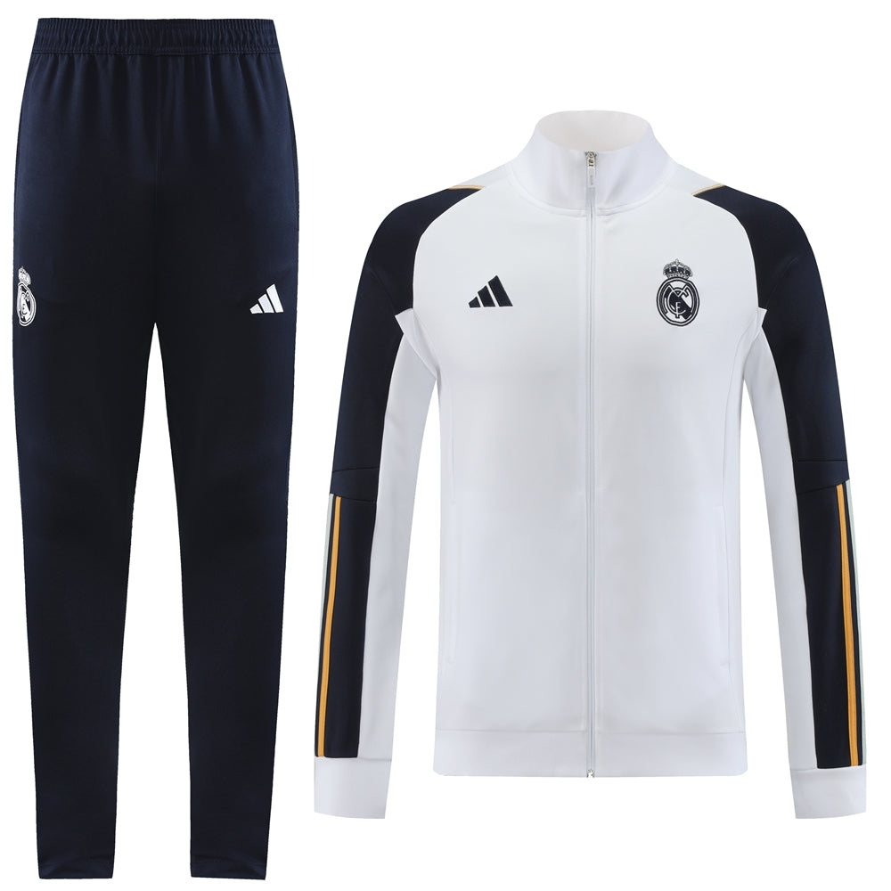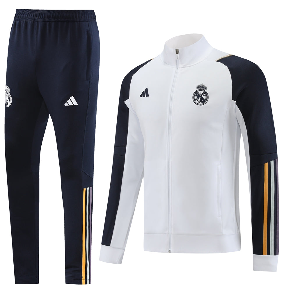 The Real Madrid 23/24 Tracksuit embodies sophistication and performance, perfect for training and casual wear. This set includes a zip-up jacket and matching pants, both adorned with Real Madrid's iconic white color and subtle accents in gold and navy blue, complemented by the club crest. Crafted from high-quality, breathable fabric, it ensures comfort and flexibility during activities. The tracksuit's modern design and athletic fit reflect the prestige and tradition of Real Madrid, making it an essential choice for loyal fans and athletes alike.