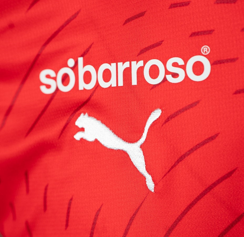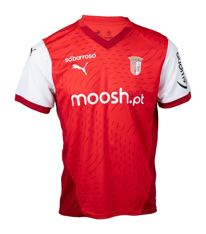 Embrace the passion of SC Braga with the 2024/25 Home Jersey. Dominated by the club's traditional red and white colors, this jersey features sleek, modern design elements that reflect Braga's bold spirit. Engineered with advanced fabric technology for optimal comfort and performance, it proudly displays the SC Braga crest on the chest. Perfect for fans who want to show their unwavering support both on and off the pitch.