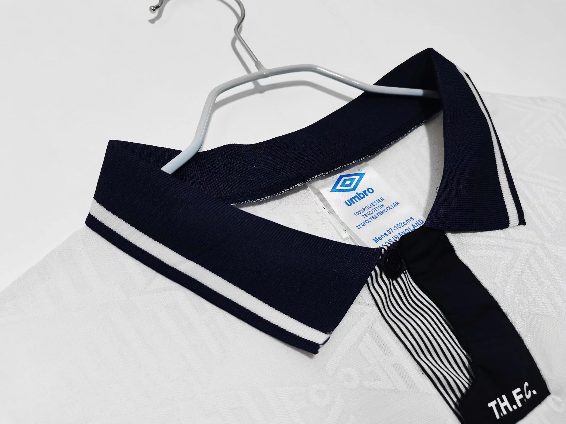 The Tottenham Hotspur club crest would have been prominently displayed on the left side of the chest. The shirt would also have featured the team's sponsor at the time. During the early 1990s, Holsten was a prominent sponsor for Tottenham, and their logo would have been visible on the jersey. The jersey would have featured the logo of the kit manufacturer, and during that period, Umbro was commonly associated with Tottenham Hotspur, so the jersey would have featured the Umbro logo.